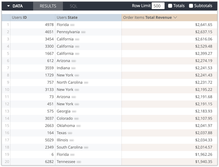 type: average-Messwert für die neue Dimension „Gesamtumsatz“ (order_items_total_revenue) erstellen:dimension: order_items_total_revenue { type: number sql: ${TABLE}.order_items.total_revenue ;; value_format_name: usd } measure: average_revenue { type: average sql: ${order_items_total_revenue} ;; value_format_name: usd } - Prüfen Sie noch einmal, ob in der abgeleiteten Tabelle ein Primärschlüssel definiert ist.