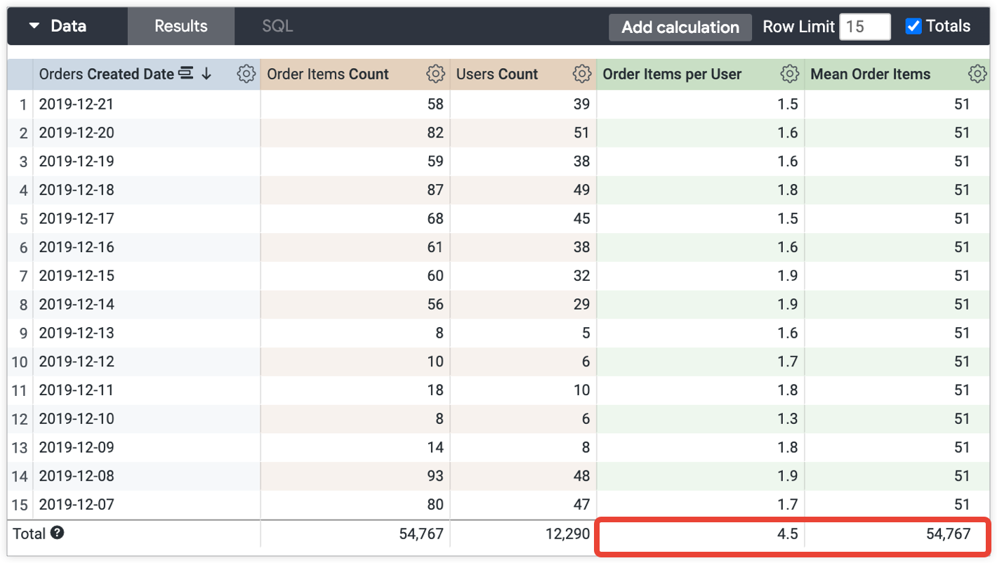 Le total pour Articles de commande par utilisateur est de 4,5, soit le total arrondi attendu de 54 767 (Nombre total d'articles de commande) divisé par 12 290 (Nombre total d'utilisateurs).