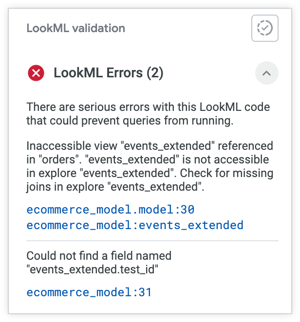 Como a mesclagem definida na análise events_extended faz referência ao nome da visualização estendida, events_extended, o Validador do LookML mostra um erro inaccessible view.