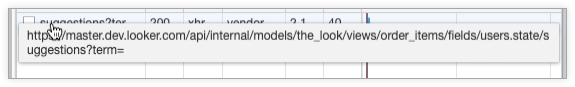 4. Le intestazioni mostreranno la richiesta API interna che Looker sta effettuando per recuperare i valori dei suggerimenti. In questo esempio, supponiamo che Looker stia effettuando la seguente richiesta API, dove <yourinstance> rappresenta l'URL della tua istanza: