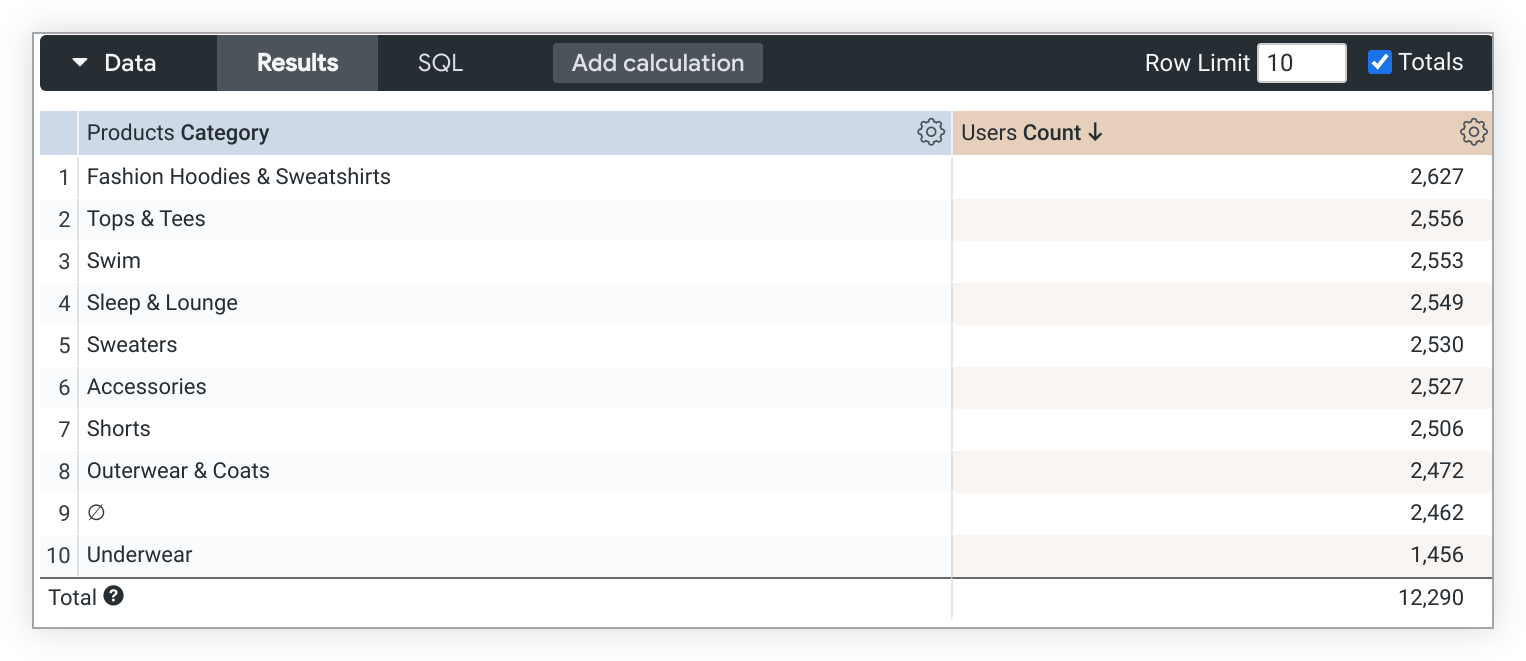 Notez que si vous ajoutez manuellement les valeurs de la colonne Nombre d'utilisateurs, vous obtenez un nombre beaucoup plus élevé que le total indiqué par Looker. Étant donné que chaque utilisateur peut effectuer des achats dans plusieurs catégories de produits, lorsque vous additionnez vous-même chaque ligne, vous ajoutez certains utilisateurs plusieurs fois. Toutefois, Looker utilise une requête SQL pour calculer le nombre d'utilisateurs distincts et éviter ainsi les doubles comptes.