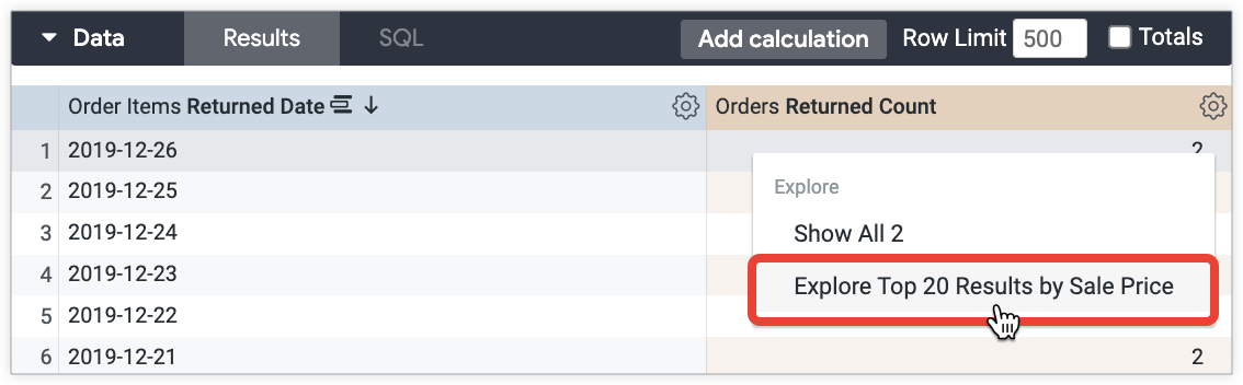 除了限制数据外,您还可以控制细钻表格中数据的排序方式。例如,如果用户深入分析退回次数指标值,您想按促销价显示 20 个结果,该怎么办?您可以使用 link 参数并将 url 子参数设置为 "{{ link }}&sorts=order_items.sale_price"。以下 LookML 代码将自定义排序与自定义行数限制相结合: