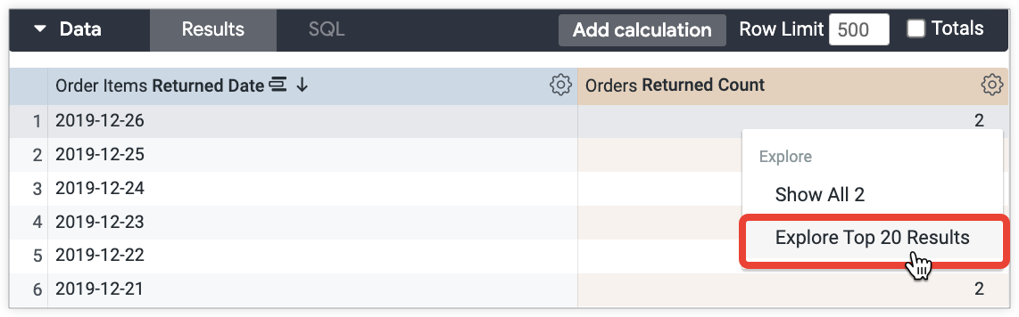 Além de limitar os dados, também pode controlar a forma como os dados são ordenados numa tabela de detalhe. Por exemplo, e se quisesse apresentar os 20 resultados por Preço de venda quando um utilizador detalha um valor da métrica Quantidade devolvida? Pode usar o link parâmetro e definir o subparâmetro url como "{{ link }}&sorts=order_items.sale_price". O seguinte código LookML combina a ordenação personalizada com um limite de linhas personalizado: