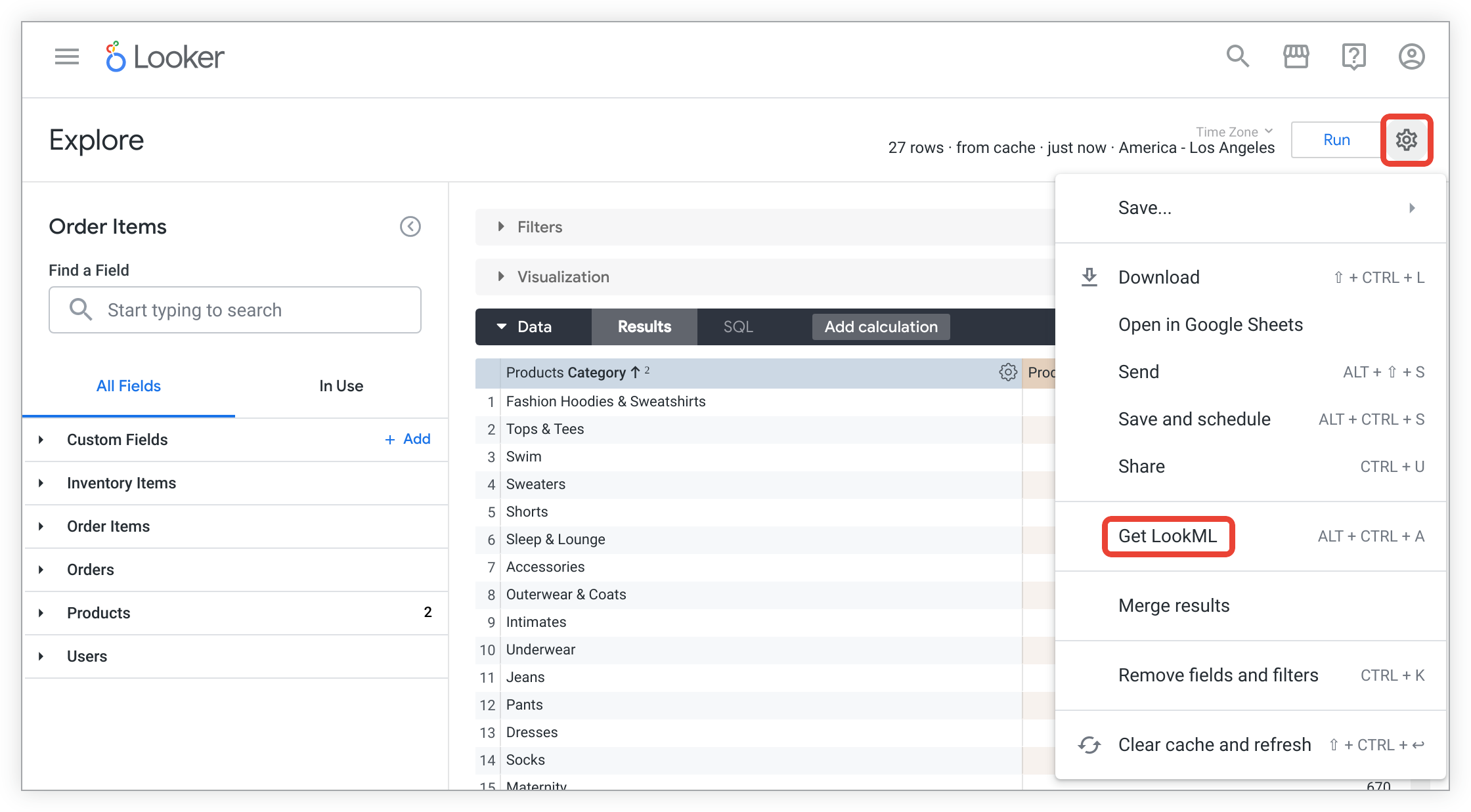 1. Cliquez sur le menu en forme d'engrenage de l'exploration, puis sélectionnez Obtenir LookML.