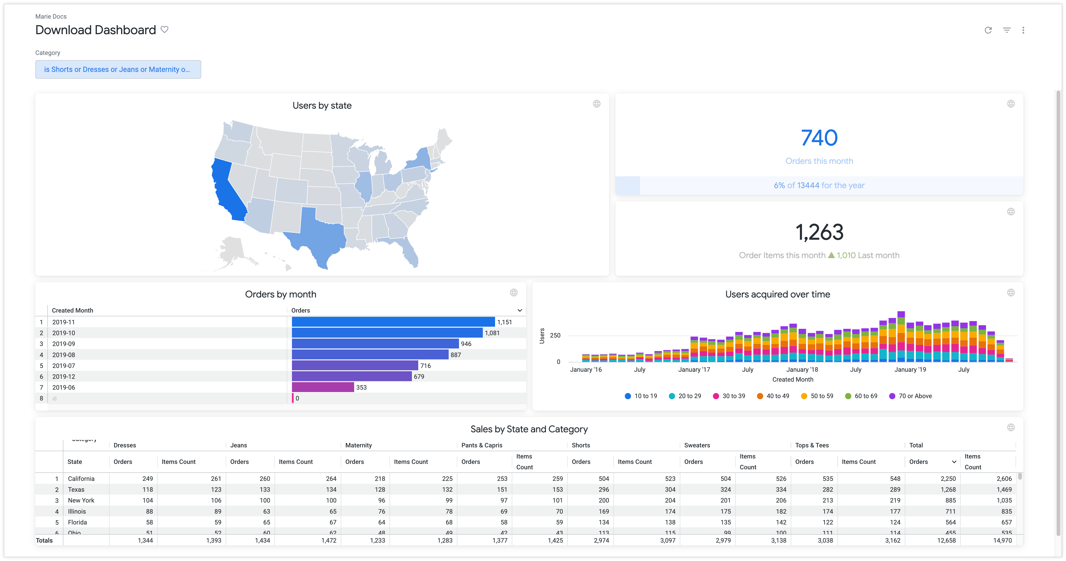 Por padrão, um arquivo PDF reflete o que você vê ao acessar o painel no navegador com uma largura de 1.680 pixels. Confira um exemplo de download de PDF com as configurações padrão do Looker: