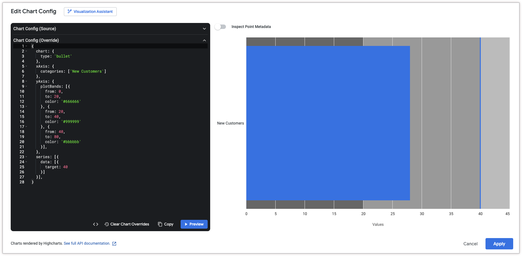 series.data.targetespecifica o valor de destino para o gráfico de marcadores, que aparece como uma linha vertical. Neste exemplo, o alvo é 40.