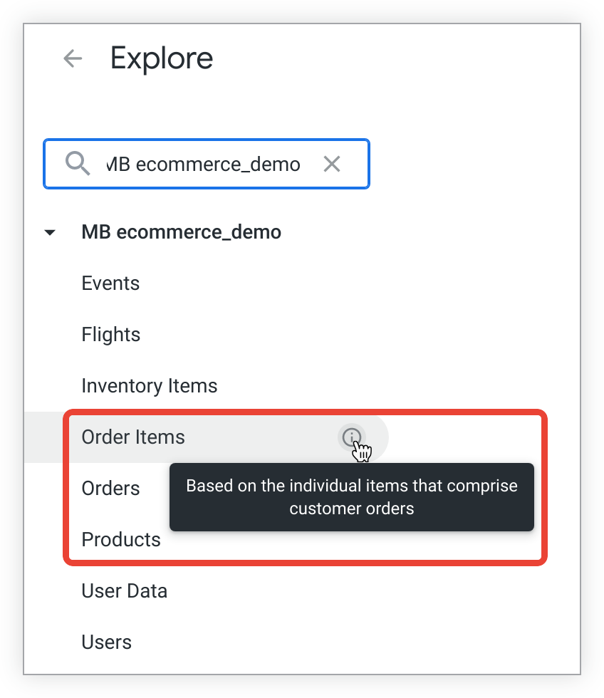En este ejemplo, la vista order_facts aparece como Pedidos y más en el selector de campos de la sección Explorar Artículos de pedido.