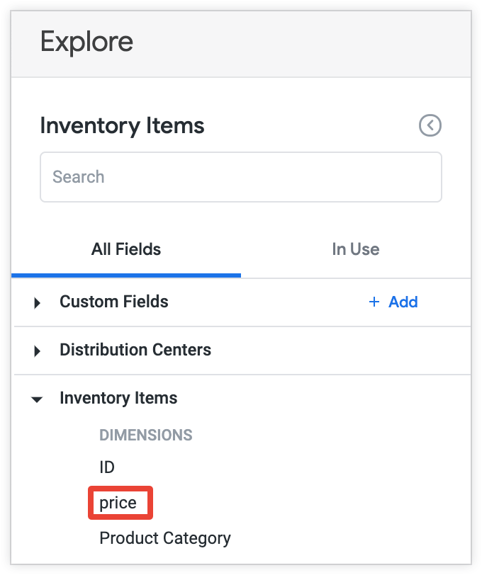 En este ejemplo, la dimensión Cost tiene la etiqueta price en el selector de campos.