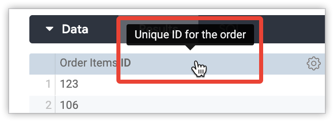 Además, Looker también muestra la descripción cuando el usuario coloca el cursor sobre el nombre de la columna en una visualización de tabla o de gráfico de tabla en una exploración, un panel de control o un Look.
