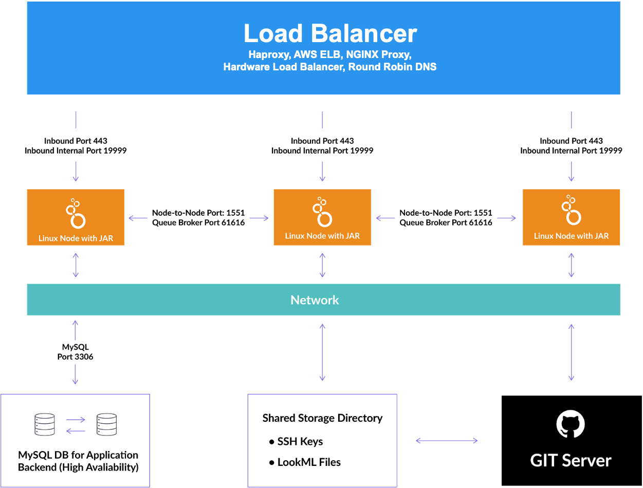 To balance the load or redirect requests to available nodes, a load balancer or proxy server (for example, NGINX or AWS ELB) is required to direct traffic to each Looker node. The load balancer handles health checks. In the event of a node failure, the load balancer must be configured to reroute traffic to the remaining healthy nodes.