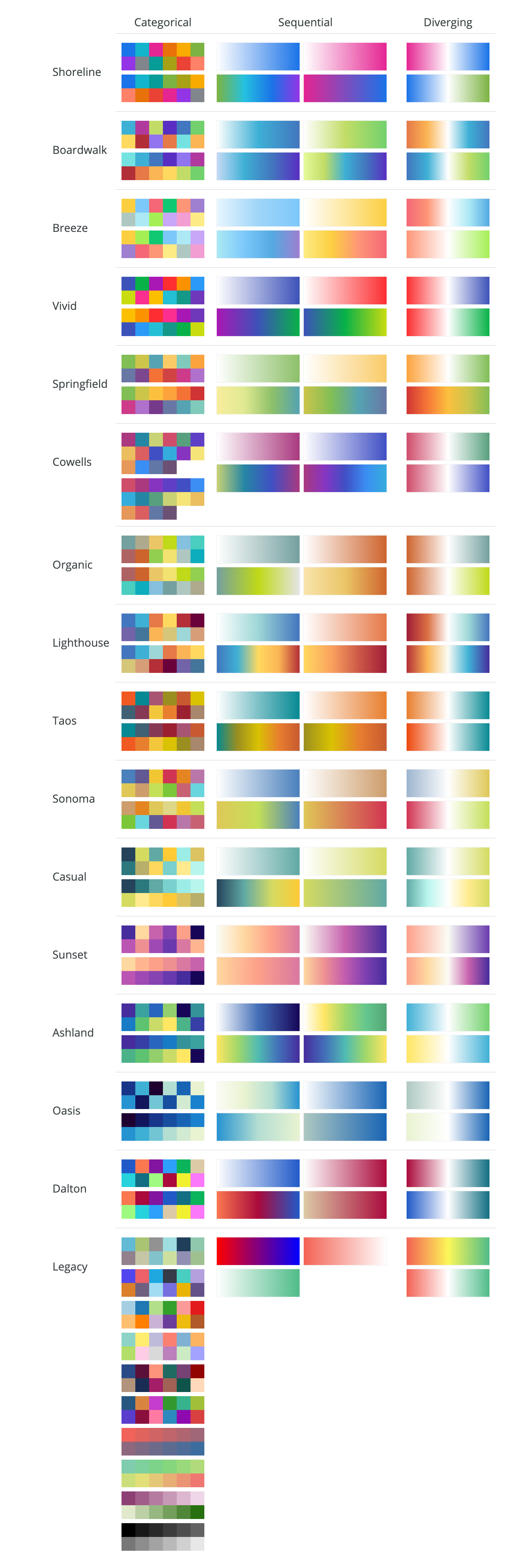 Each color collection contains categorical, sequential, and diverging palettes.