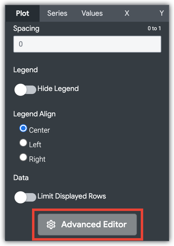 Le bouton Modifier la configuration du graphique en bas du menu de visualisation ouvre l'éditeur de configurations de graphiques. Cet éditeur vous permet de modifier les visualisations HighCharts en exposant certains paramètres JSON de la visualisation, ce qui permet une personnalisation approfondie. Ces personnalisations n'interagiront pas de manière dynamique avec les données.
