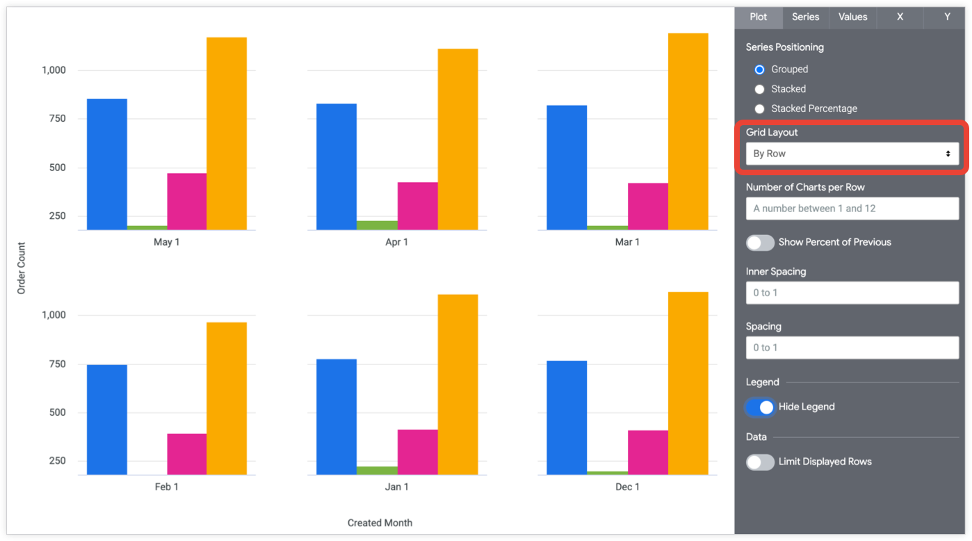 グラフは、最大で 12 個の小さなグラフに分割できます。行またはピボットの数が 12 を超える場合は、[Row Limit]、[Column Limit]、または [Limit Displayed Rows] を使用してデータを制限します。