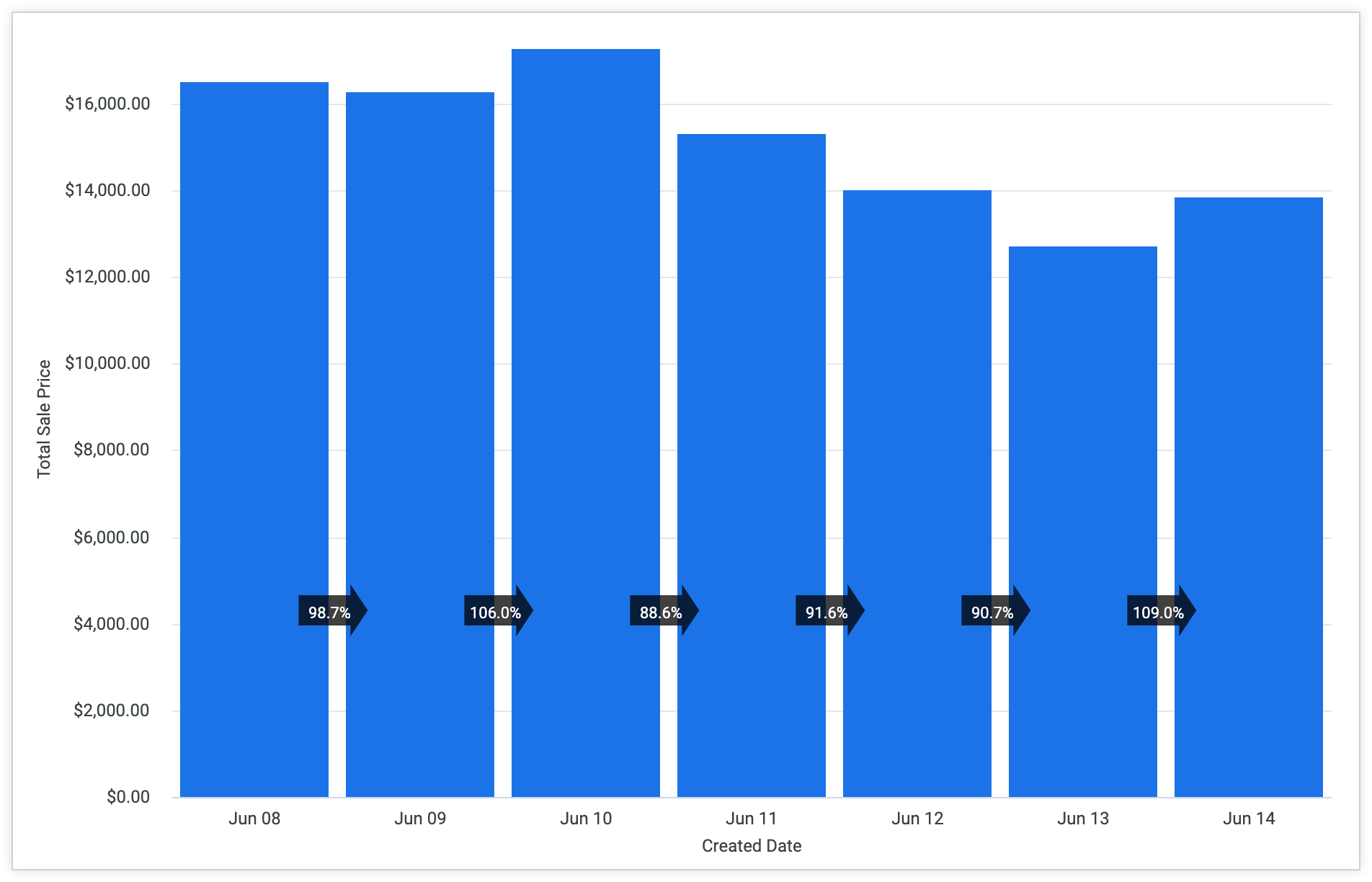 各系列で、これらの矢印は、左から右へ、前の値に対する割合を表示します。