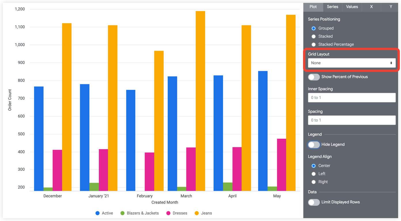 Quando selezioni Per tabella pivot o Per riga dal menu a discesa, viene visualizzata l'opzione Numero di grafici per riga. Puoi inserire un numero compreso tra 1 e 12. Se non inserisci un numero, Looker dispone i grafici nel modo più uniforme possibile.