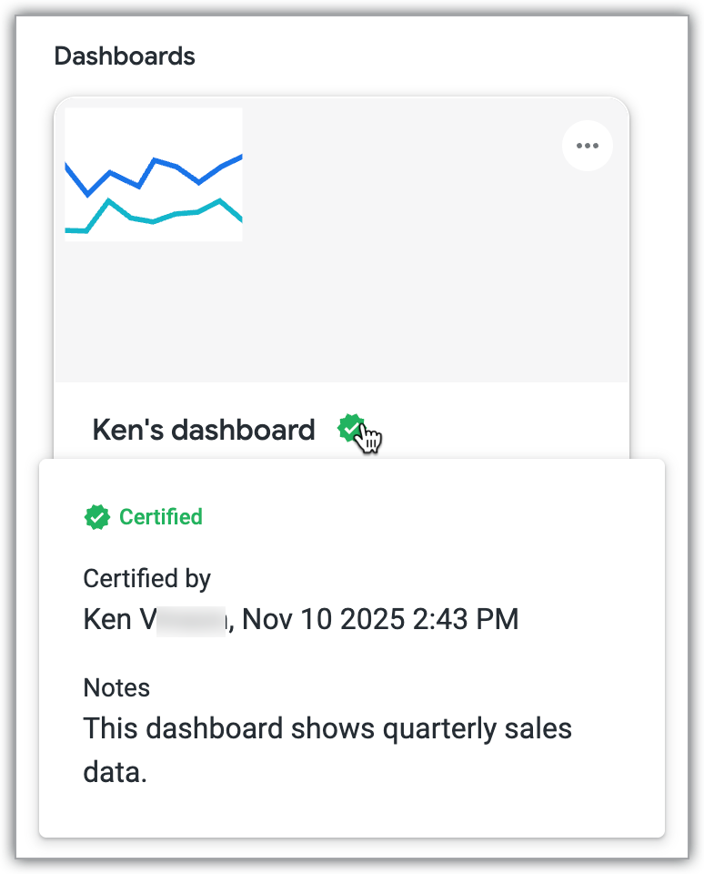 在信息中心和 Look 的详情面板中,您可以查看认证元数据,包括认证者的姓名、认证日期和时间,以及认证者保存的任何备注。