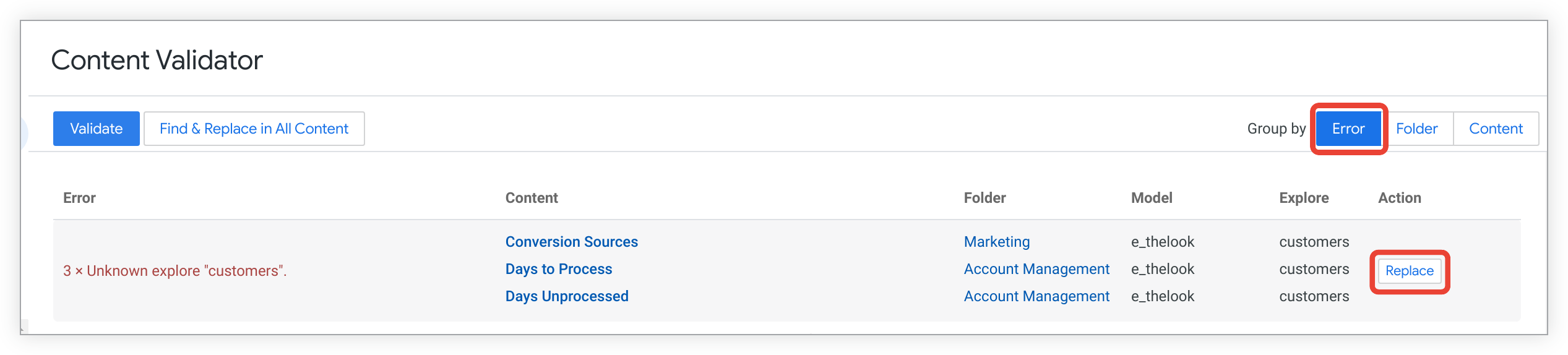 たとえば、エラーテーブルはエラーでグループ化され、customers という不明な Explore を含む 3 つのコンテンツ インスタンスが表示されます。3 つのコンテンツに対して提供されるアクションは [Replace](置換)です。[置換] をクリックすると、エラー 3 x Unknown explore 'customers' が発生している 3 つのコンテンツ インスタンスすべてに影響します。