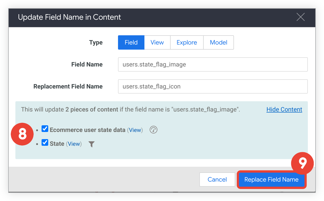 フィールド、ビュー、Explore、モデルの名前の置換