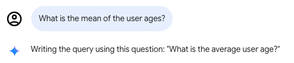 Anda dapat mengajukan pertanyaan untuk mendapatkan insight dari data Anda. Saat Anda memulai percakapan baru, Analisis Percakapan menyarankan beberapa pertanyaan awal yang dapat diajukan. Pertanyaan tidak harus dalam format tertentu atau menggunakan sintaks tertentu. Namun, kolom tersebut harus terkait dengan Eksplorasi yang telah Anda pilih. Analytics Percakapan dapat menyusun ulang pertanyaan Anda setelah Anda menulis kueri, dan pertanyaan yang disusun ulang akan ditampilkan di jendela percakapan setelah pertanyaan asli Anda. Misalnya, Analisis Percakapan dapat memparafrasakan pertanyaan "Berapa rata-rata usia pengguna?" menjadi "Berapa rata-rata usia pengguna?"