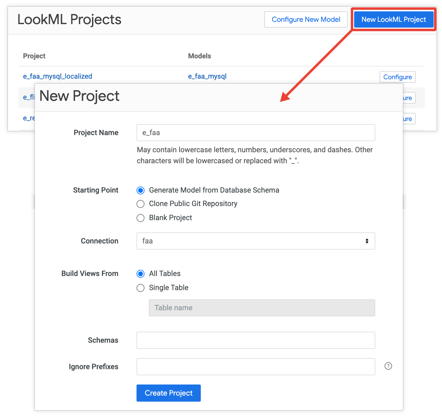 Na página Projetos do LookML, selecione Novo projeto do LookML para selecionar as opções do seu projeto.