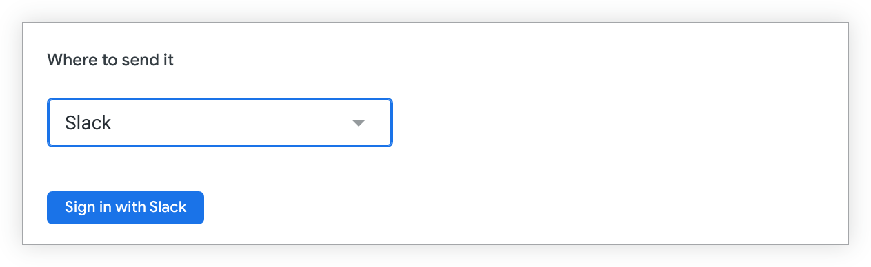 Si aún no te has autenticado en Slack, aparecerá el botón Iniciar sesión con Slack en el menú desplegable Dónde enviarlo.