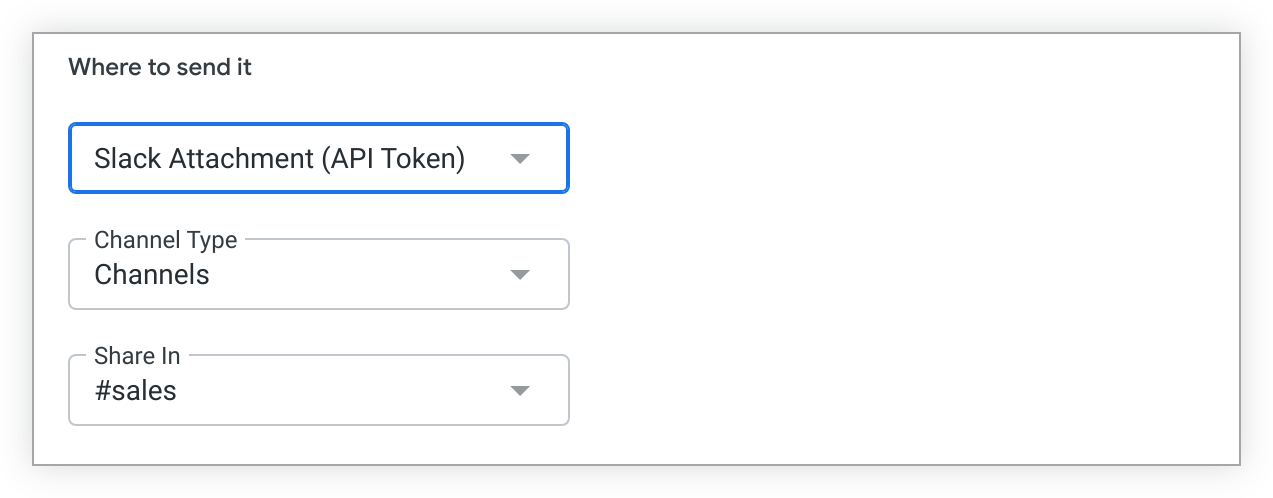 1. Selecione Anexo do Slack (token da API) no menu suspenso Destino de envio.