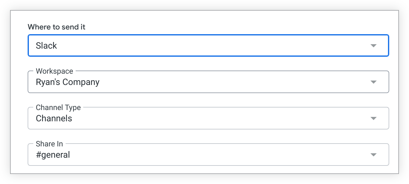 Depois de selecionar o tipo de canal, o campo Compartilhar em será preenchido com as opções de canal ou mensagem direta aplicáveis às credenciais do usuário do bot do app Looker no espaço de trabalho do Slack.