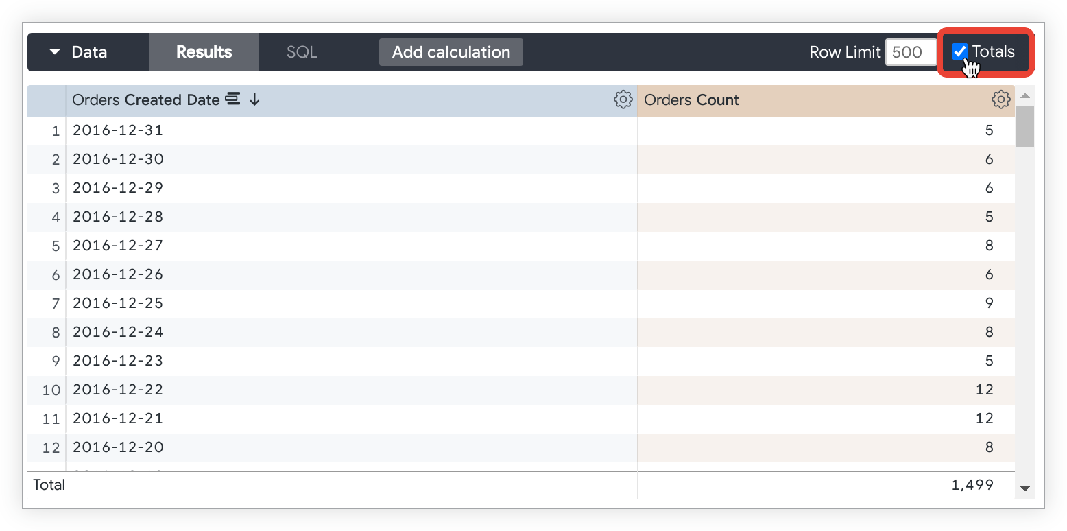 데이터 요약이 유용한 경우도 있습니다. Explore 데이터 표 오른쪽 상단의 합계 체크박스를 선택하고 쿼리를 다시 실행하면 Explore 쿼리에 열 총계를 추가할 수 있습니다.