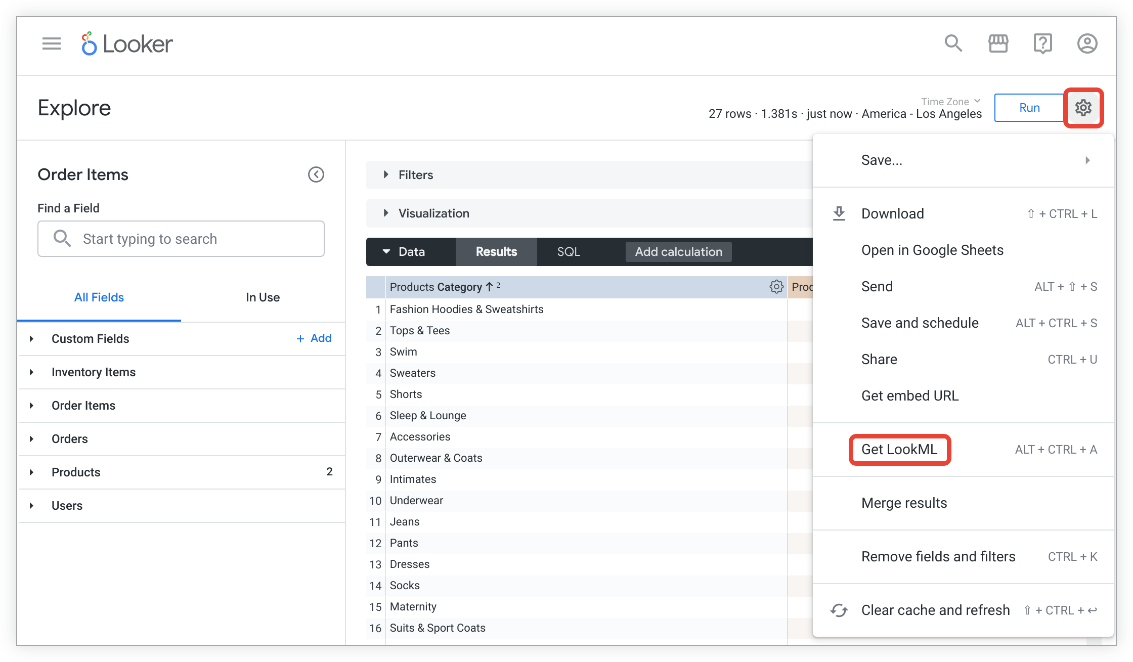 Starting with an Explore, Looker can generate LookML for all or most of your derived table. Just create an Explore and select all the fields you want to include in your derived table. Then, to generate the native derived table LookML, follow these steps: