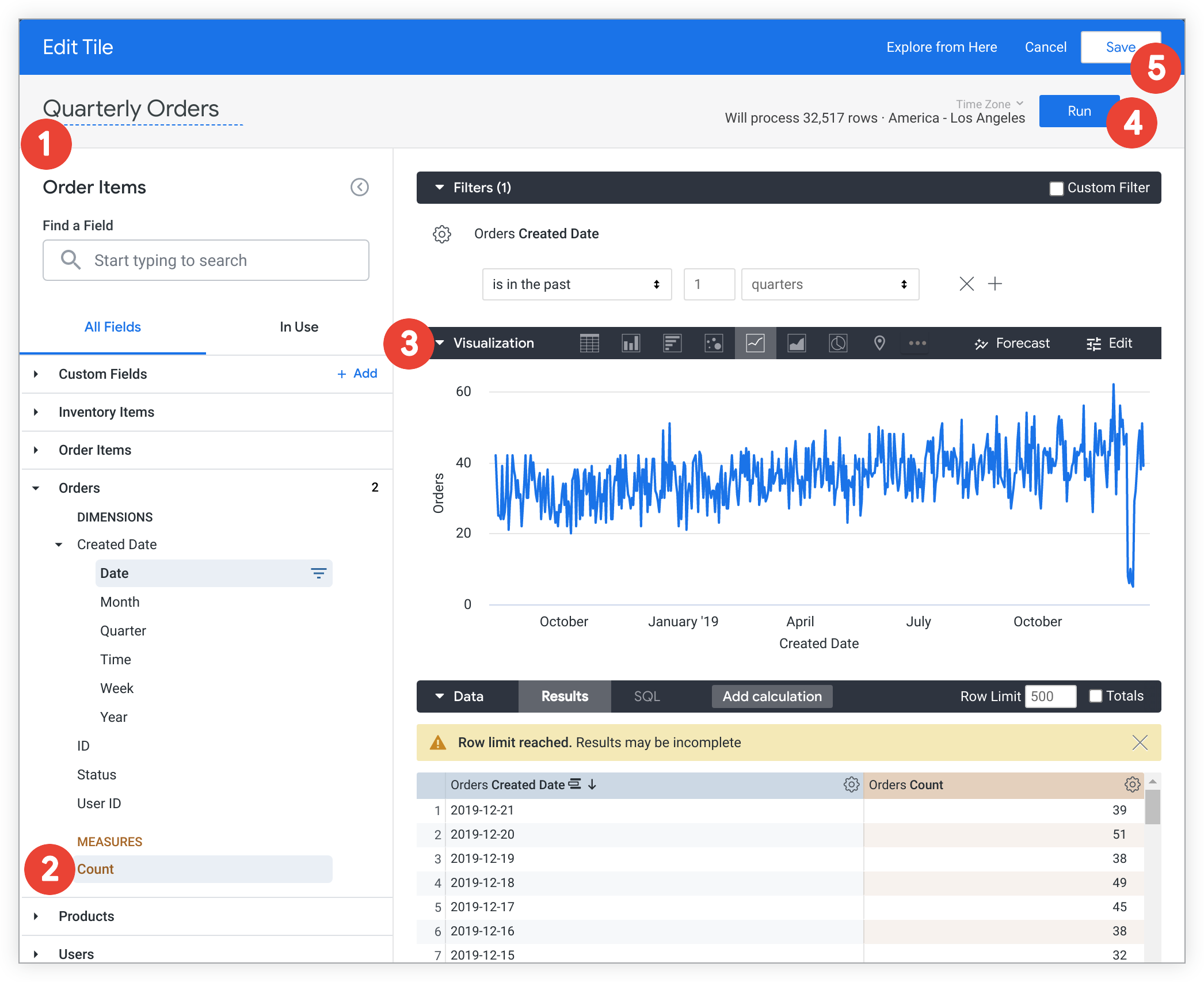 Looker 会打开探索窗口,以便您构建查询。如需构建查询,请按照下列步骤操作: