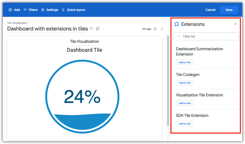 Extension tiles are custom applications called extensions that are added to a dashboard and run from inside a dashboard tile.