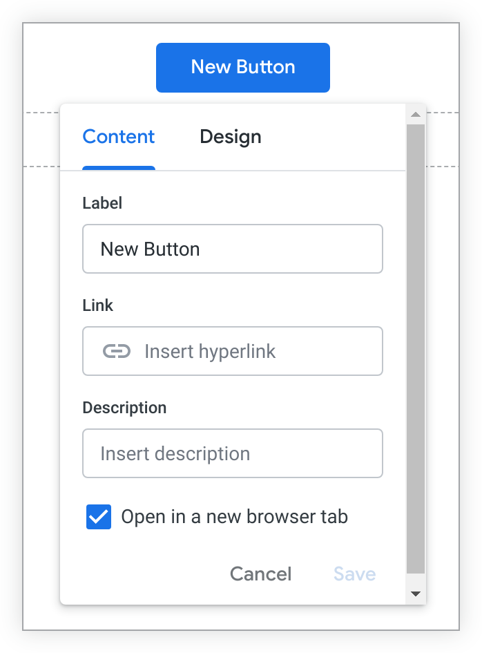 In the Design tab of the button edit window, you can customize the appearance of the button: