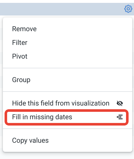 ディメンション フィルを使用するには、Exploreの [データ] セクションで該当するディメンションの歯車メニューを選択します。[欠けている日付を入力] または [欠けている値を入力] を選択します。