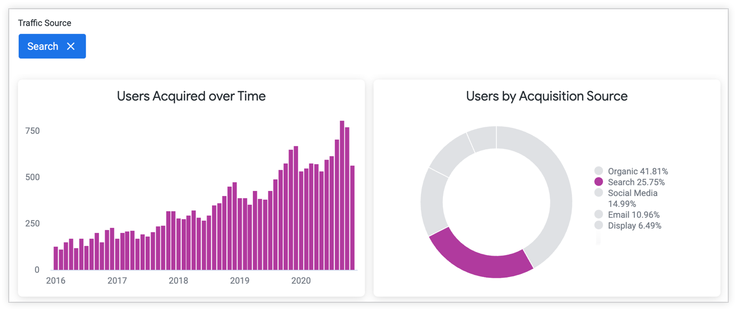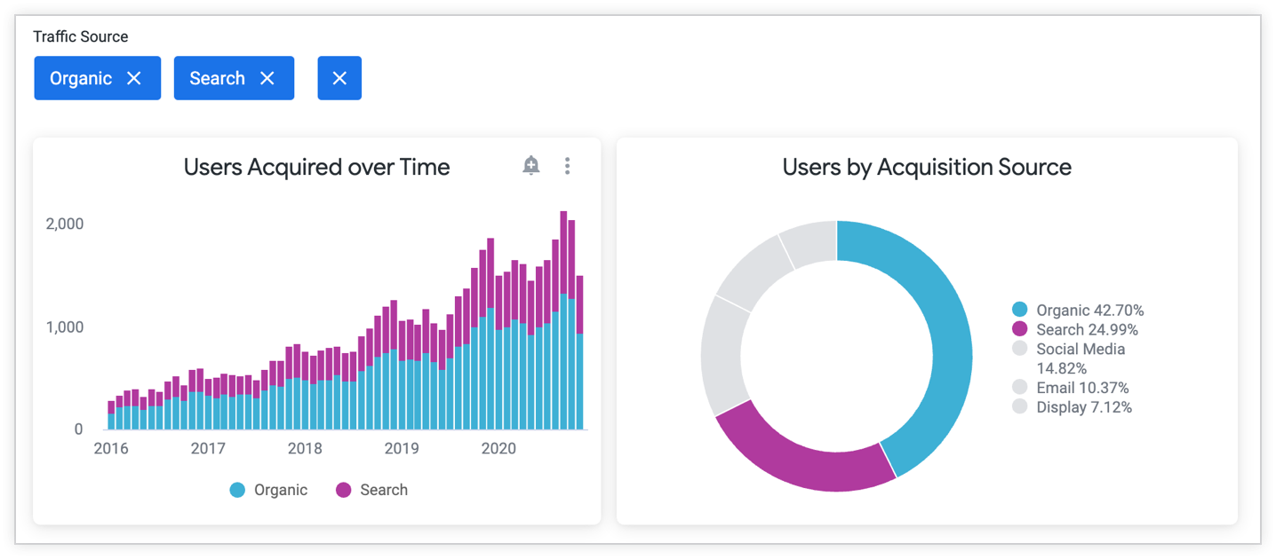 Una dashboard può contenere sia filtri incrociati che filtri standard della dashboard. I filtri incrociati vengono visualizzati dopo i filtri standard nella parte superiore della dashboard e sono di un blu più scuro. Ad esempio, nell'immagine seguente, il filtro su Status (Stato) è un filtro standard. I filtri su Created Month (Mese di creazione) e Traffic Source (Origine del traffico) sono filtri incrociati: