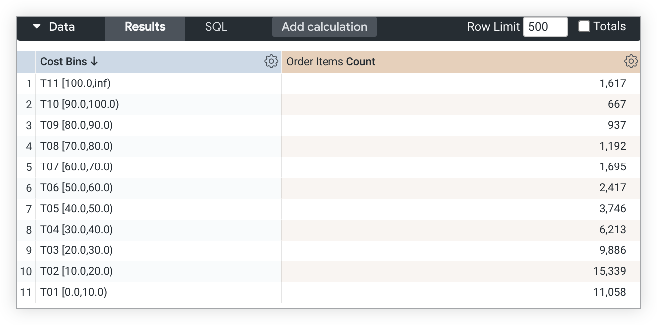 구간 커스텀 필드 유형을 사용하면 Looker 표현식에서 논리 함수를 사용하거나 type: tier LookML 필드를 개발하지 않고도 숫자 유형 측정기준과 커스텀 측정기준에 대한 임시 커스텀 구간 또는 등급을 만들 수 있습니다.