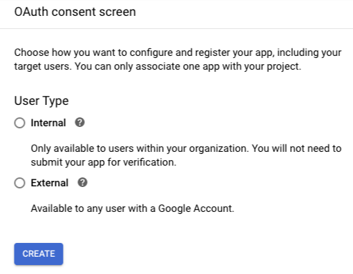 Effettua la selezione e seleziona Crea. Google mostra la pagina Schermata per il consenso OAuth. Puoi configurare questa schermata per tutte le applicazioni del tuo progetto, incluse quelle interne e pubbliche.