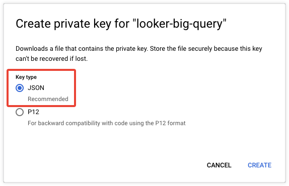 - Carica file JSON o P12 del servizio: utilizza il pulsante Carica file per caricare il file del certificato per il account di servizio BigQuery. Puoi ottenere questo file da Google Cloud API Manager come passaggio della procedura Creazione di un account di servizio e download del certificato delle credenziali JSON.
