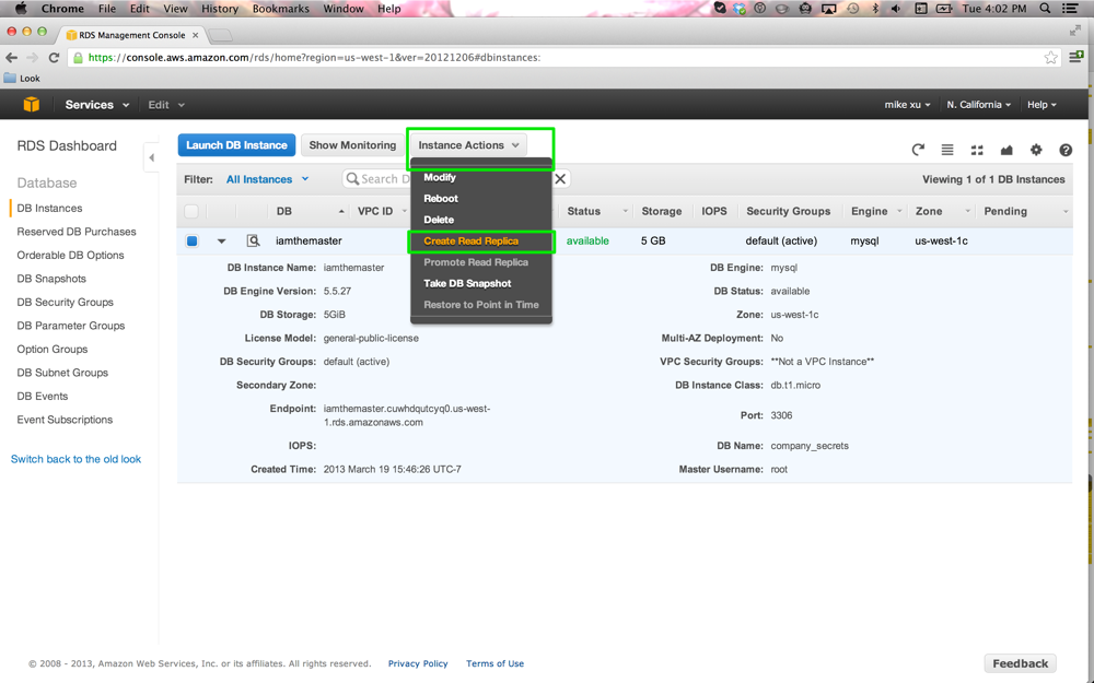 On your RDS dashboard, select the database instance you want to specify as the primary database. Select Instance Actions, and then select Create Read Replica.