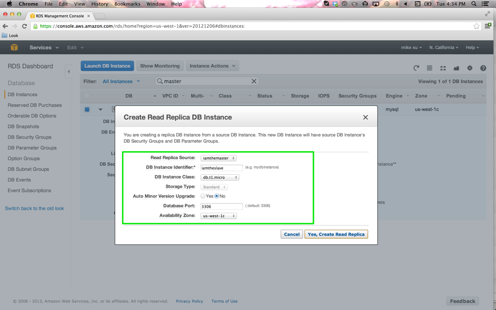 In the Create Read Replica DB Instance pop-up, configure the read replica database and select Yes, Create Read Replica.