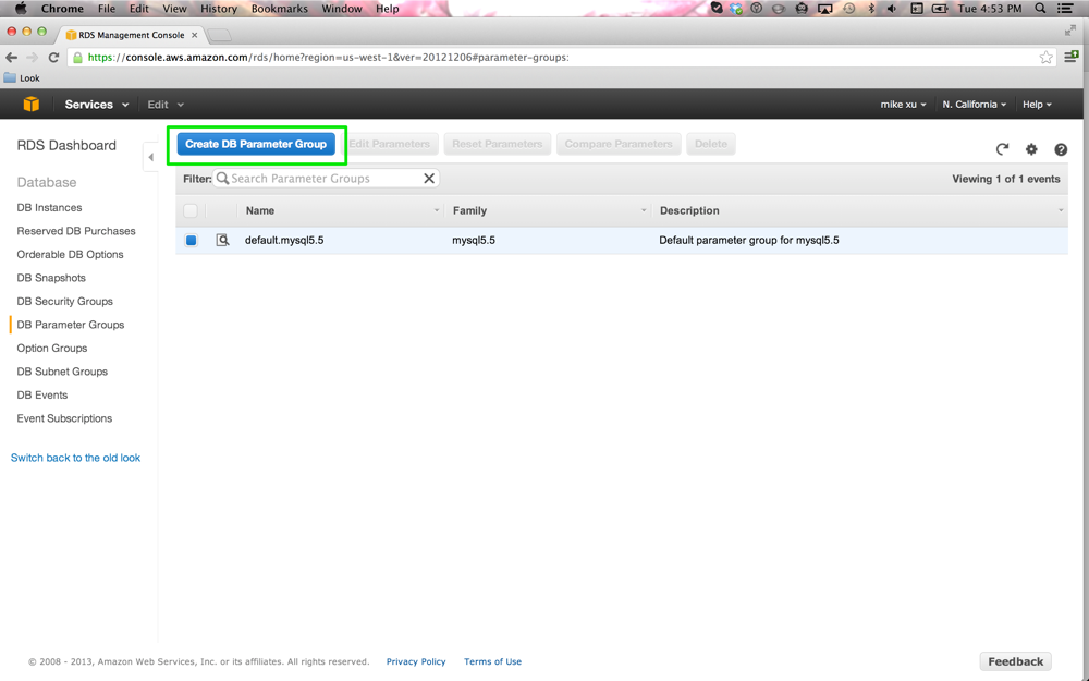 While you're waiting for the read replica database to be created, you can set up the DB Parameter Group, which will contain the engine configuration values that are applied to the read replica database instance. Select the DB Parameter Groups page in the sidebar, and then select the Create DB Parameter Group button.