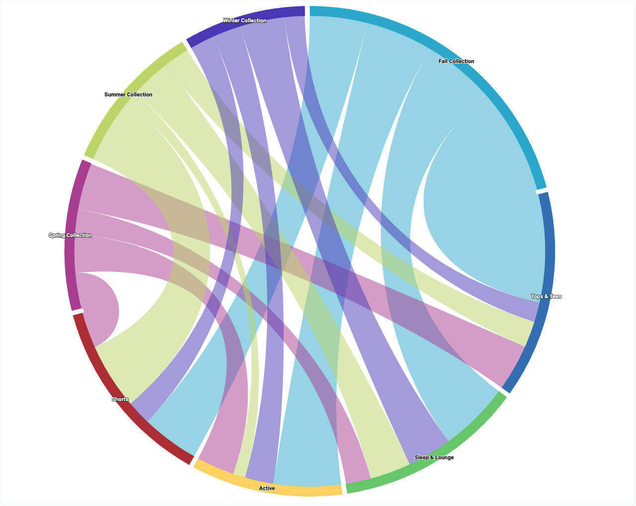 たとえば、複数の [Seasonal Collection] ディメンション値にわたる [Order Item Count] の測定値を、[Category] ディメンション値に分類して示す依存関係ホイール チャートを作成できます。各ディメンション値は、円の外側の色分けされた弧で表されます。2 つの円弧を結ぶ線の幅は、そのディメンション ペアの [Order Item Count] 指標の値に対応しています。値が大きいほど、線の幅が広くなります。