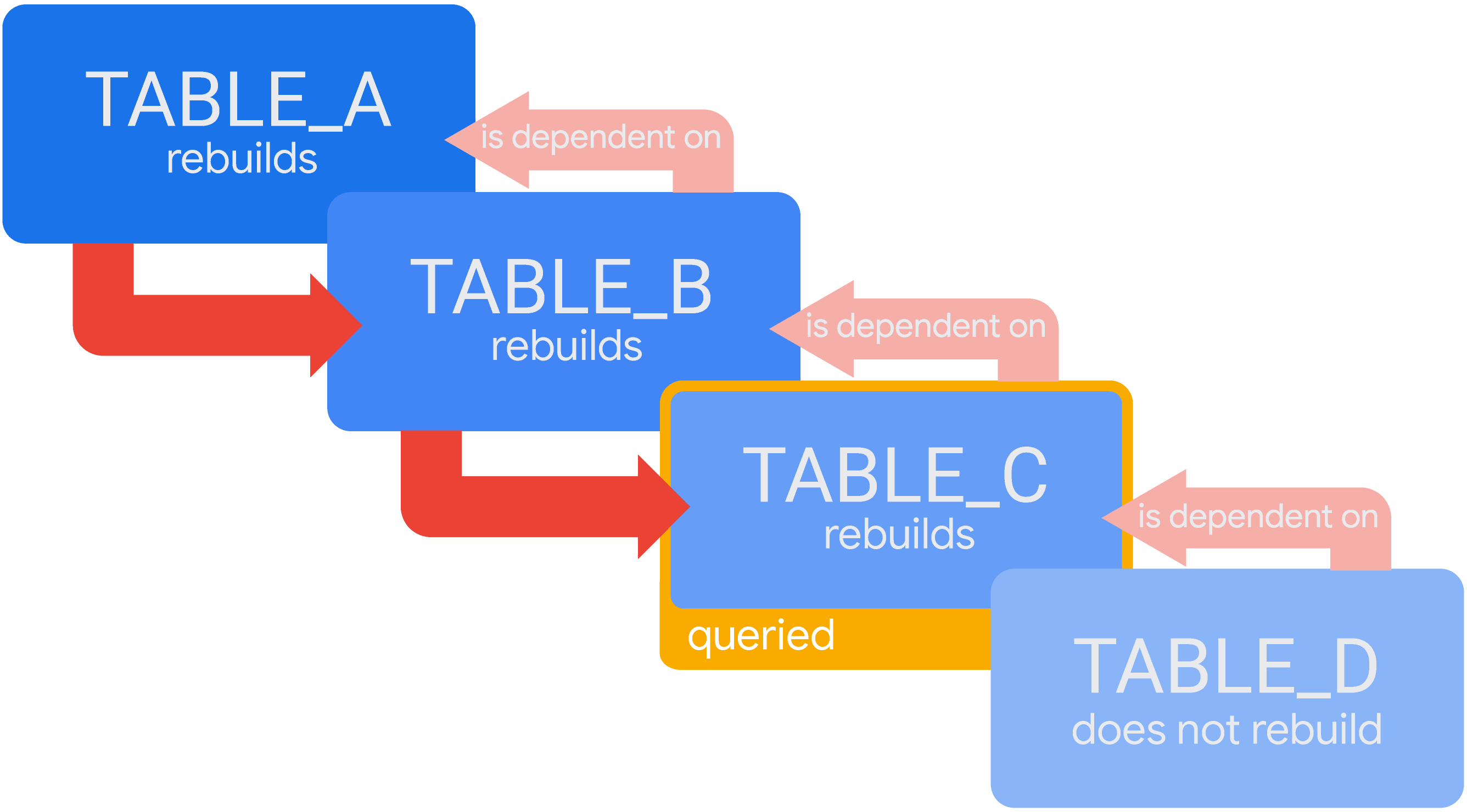 TABLE_B,则无法重建TABLE_C,因此 Looker 会针对TABLE_C上的查询返回错误。 - 然后,Looker 将尝试根据其常规持久化策略重建