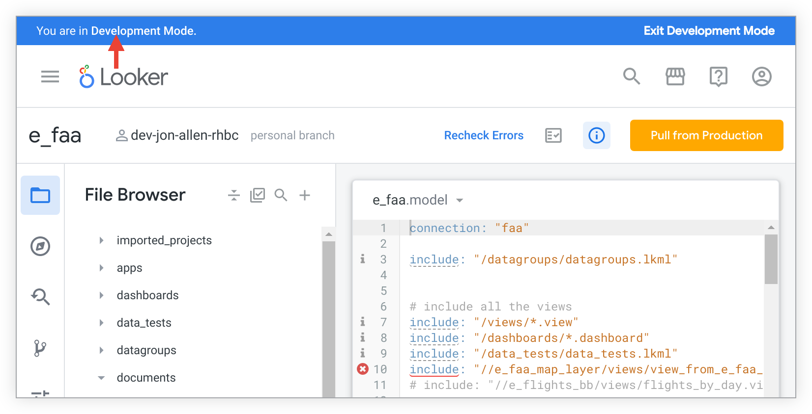 Ihr Looker-Datenmodell ist in zwei Status verfügbar: Produktionsmodus und Entwicklungsmodus.