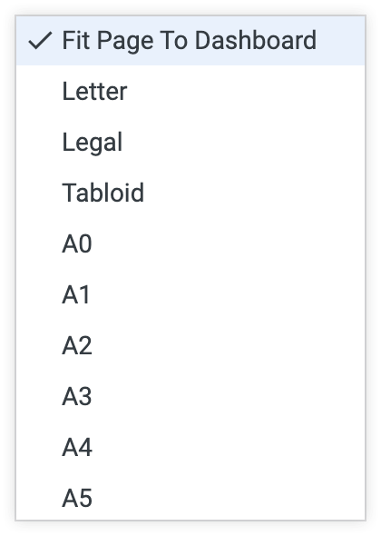 용지 크기 드롭다운에서 대시보드에 페이지 맞추기 이외의 항목을 선택하면 방향 옵션이 표시됩니다. 대시보드의 방향을 세로 또는 가로로 선택할 수 있습니다.