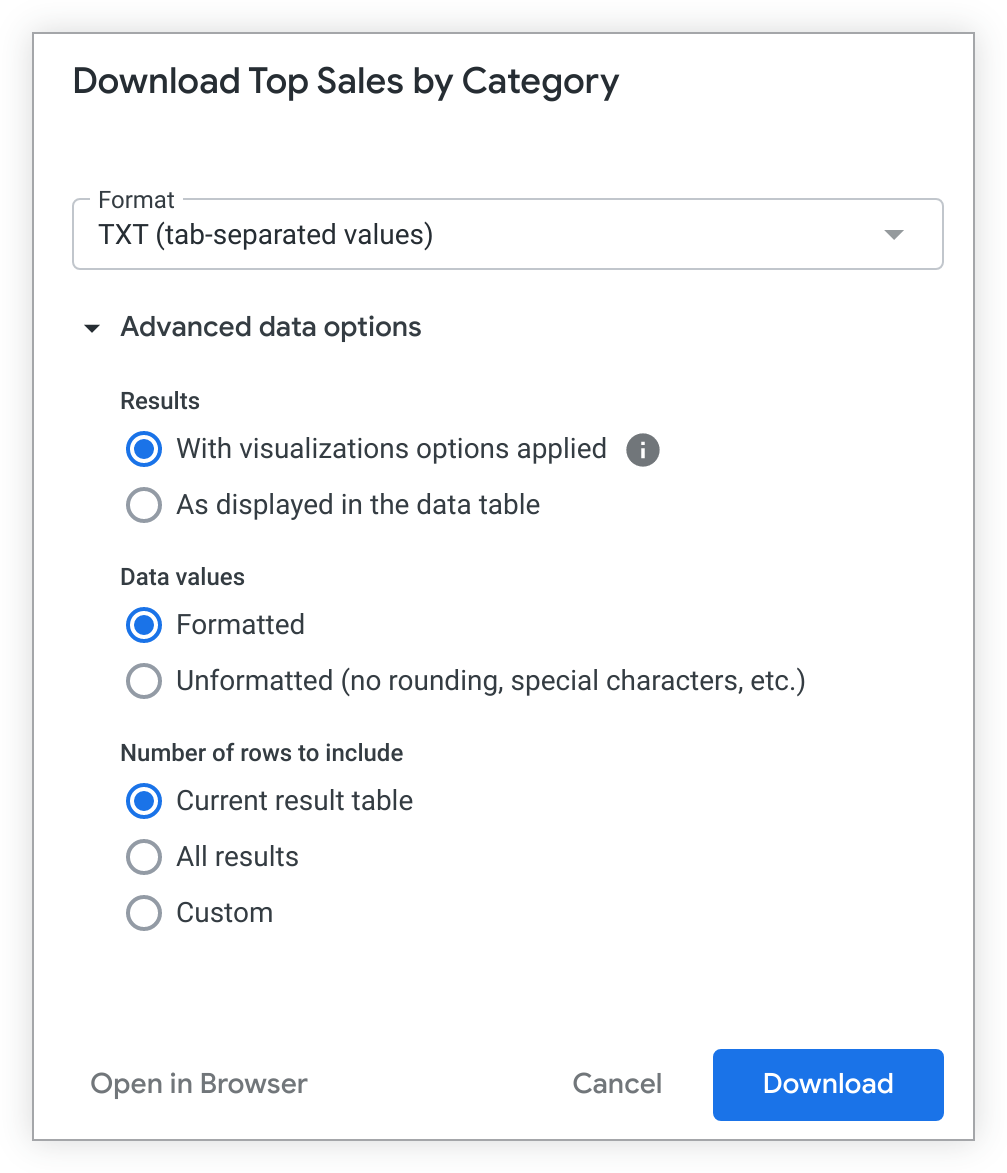 데이터 다운로드 대화상자에는 Look 또는 Explore용 옵션과 유사한 여러 옵션이 표시됩니다. 고급 데이터 옵션 메뉴를 펼쳐 다운로드에 사용할 수 있는 모든 옵션을 확인합니다.