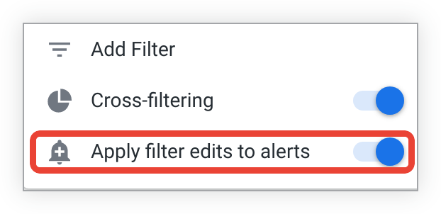 | 新增或移除資訊主頁篩選器 | 是 | 雖然系統會將變更同步處理至快訊,但更新資訊主頁篩選器可能會影響查詢結果。您可能需要編輯快訊觸發值,以納入新的資料值範圍。 |
