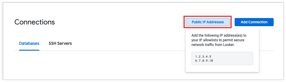 L'elenco degli indirizzi IP necessari per consentire il traffico di rete dalla tua istanza di Looker è disponibile nella pagina Connessioni del pannello Amministrazione. Fai clic su Indirizzi IP pubblici e copia gli indirizzi IP visualizzati.
