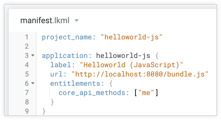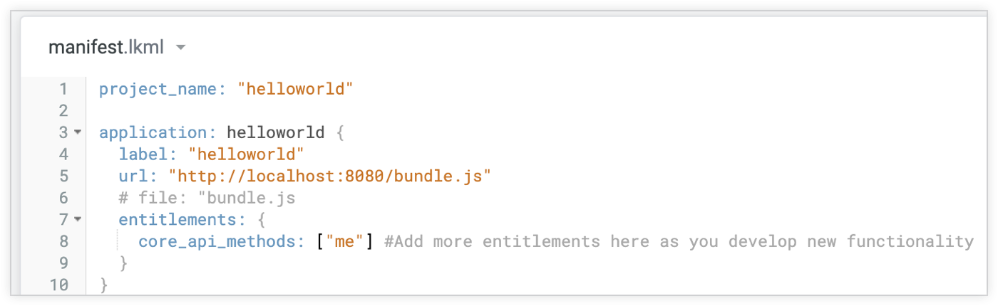 applicationparameter. Theapplicationparameter gives the extension a label, tells Looker where to find the extension JavaScript, and provides a list of entitlements for the extension. Entitlements define the Looker resources that the extension can access. The extension will not be able to access a Looker resource unless that resource is listed in the entitlements.You can leave the manifest file as is for now, though, since you will copy the rest of the file's contents into it later in this process.