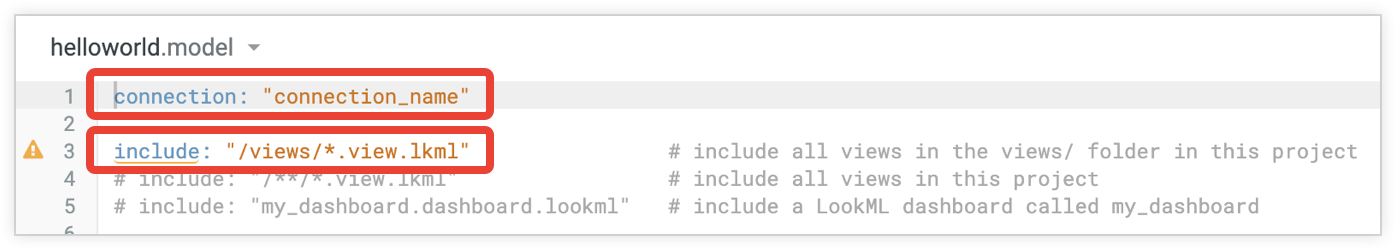 include: "/views/*.view.lkml"parameter or add a#character at the beginning of the line to make the line a comment. Leaving theinclude: "/views/*.view.lkml"parameter as is will cause the LookML validator to generate errors.Create a project manifest file by using the