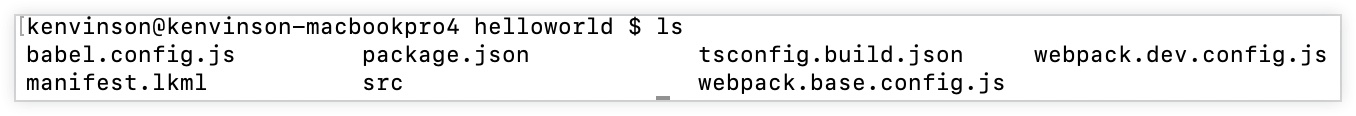 The src directory under your extension directory contains the source file where you can add code. In the previous example, for the React and JavaScript "Hello World" template, the file is called HelloWorld.js. Modifying or adding code to that file will modify or add to function of the extension.